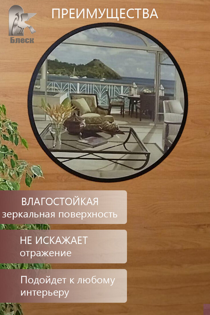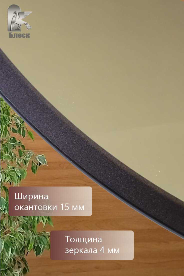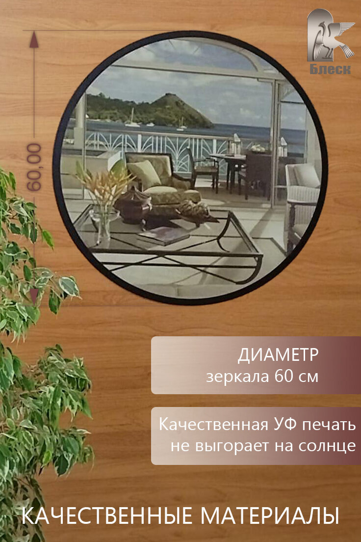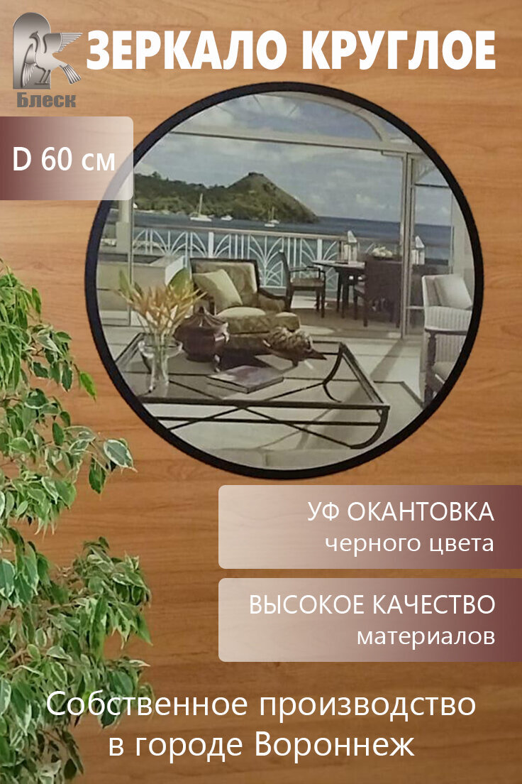 Круглое настенное зеркало с окантовкой выполненной с помощью УФ печати шириной 15мм. Диаметром 60см. От производителя ООО "Блеск". Зеркало влагостойкое и не искажает изображение. Хорошее дополнение к любому интерьеру. Имеет множество вариантов для размещения: ванная комната, спальная комната, офис, детская комната, прихожая, гостиная и тд. Фацет на зеркале придает ему аккуратный вид, блеск и элегантность. Не допускается уход за зеркалами с использованием кислотных чистящих средств.